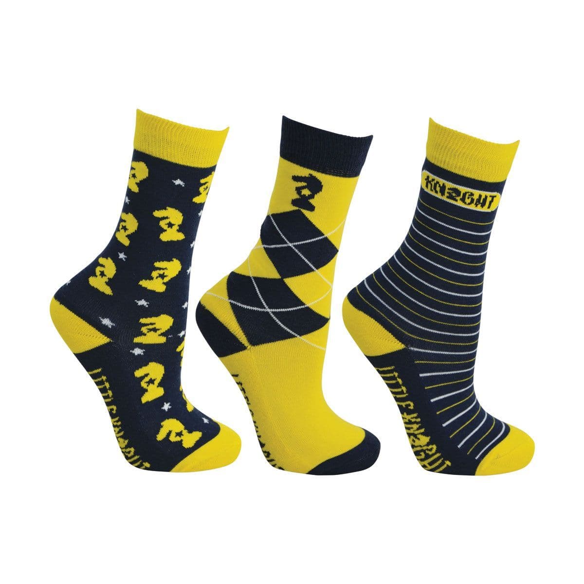 Each pair of socks feature a different Little Knight Lancelot pattern with the signature yellow and navy colours.